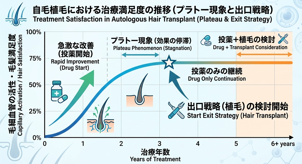 薬は、あくまで「抜け毛のブレーキ」をかけ、既存の毛を太く保つためのものです。しかし、2026年現在の長期臨床データによれば、投薬のみで20年、30年と理想の状態をキープできるケースは限られており、多くの人がどこかのタイミングで効果の停滞(プラトー)を感じます。