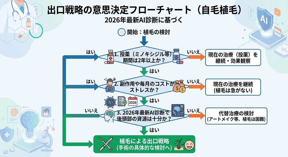 AGA治療の「出口戦略」。いつまで薬を飲み、いつ植毛するか|2026年最新エビデンスに基づく生涯設計ガイド