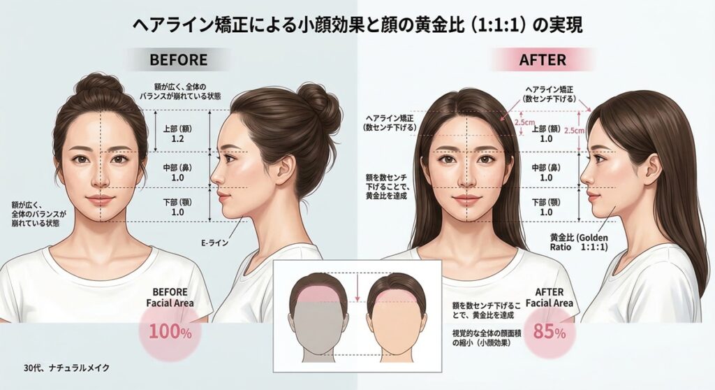 ヘアライン矯正において最も大切なのは、単に生え際の位置を下げることではありません。お顔全体のバランス、いわゆる「黄金比」を整えることにあります。