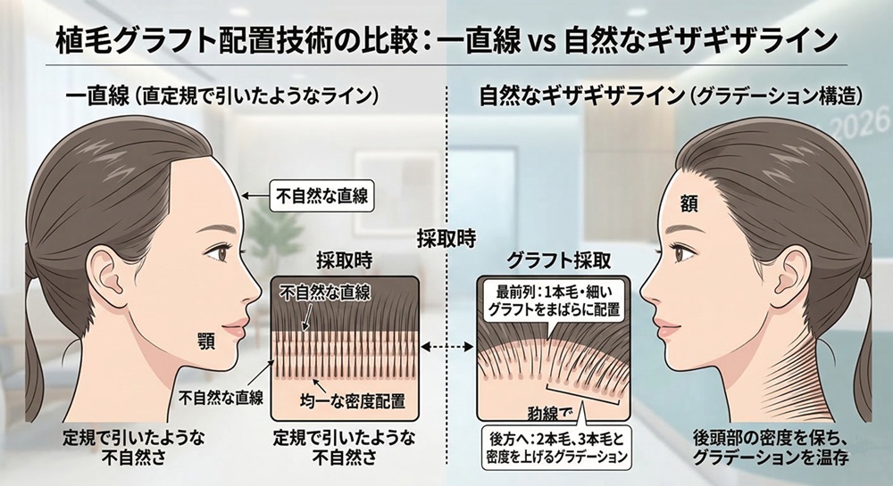 2026年の高度な技術では、あえて1本毛の細いグラフトを最前列に、ジグザグに配置する「フェザーリング・テクニック」が用いられます。また、髪が皮膚から生え出す角度を極限まで寝かせることで、本物の産毛のような質感を再現します。