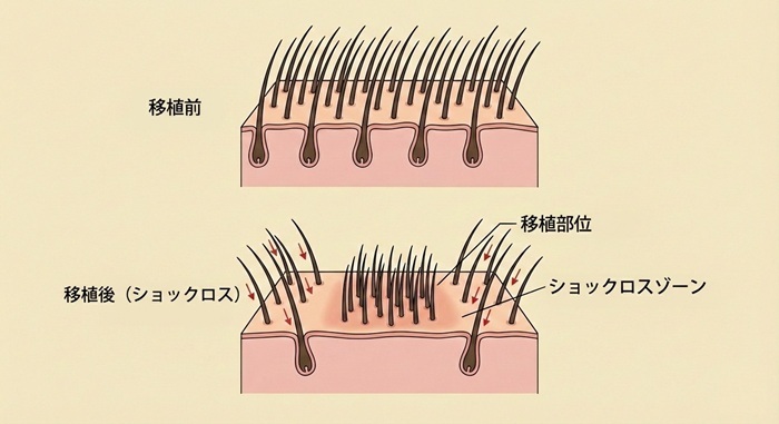 ショックロスとは、植毛手術による頭皮への刺激や、一時的な血流の変化、局所麻酔の影響などによって、移植部位の周辺に元々生えていた毛が、手術後に一時的に抜けてしまう現象のことです。