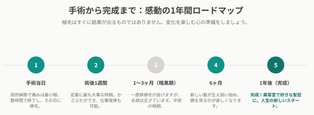- 術後1週間: 毛根が定着する運命の時期。激しい運動を避け、安静に過ごします。