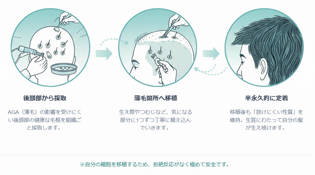 - 一生生え続ける: 後頭部の毛根には「ドナードミナンス」という性質があり、移植先でも一生髪を作り続ける能力を維持します。
