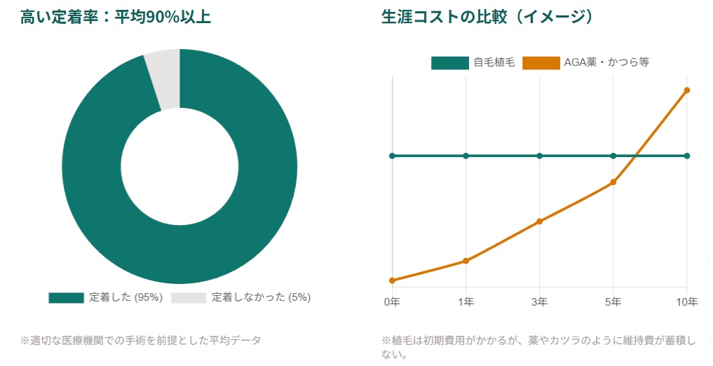 医学的なデータによると、移植した毛根がしっかり生えつく「定着率」は、一般的に90%を超えます。つまり、100本植えれば90本以上は生涯生え続けるということです。(自由が丘クリニック ほか)