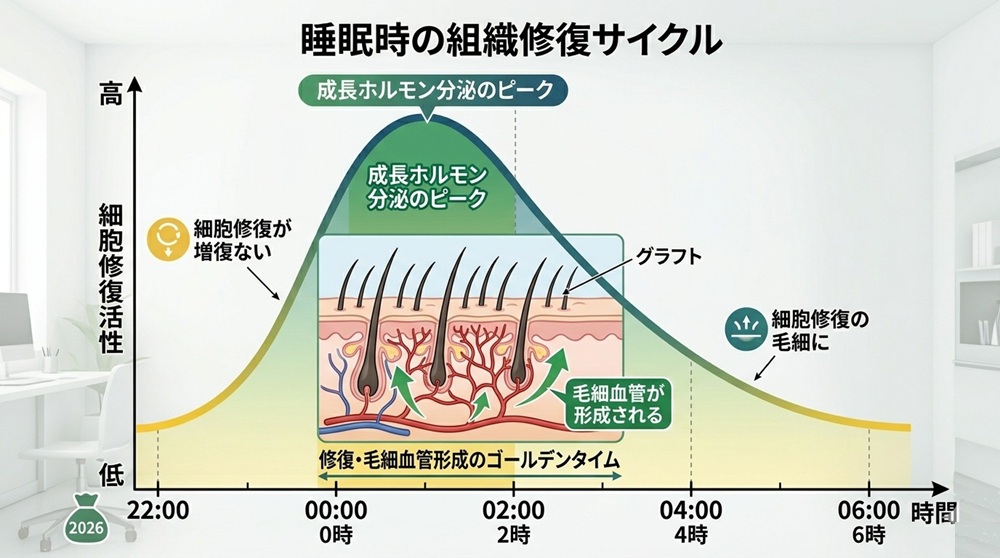 「寝る子は育つ」という言葉は、毛根の再生においても真実です。特に術後の生着率を左右するのは、入眠から最初の3時間に分泌される成長ホルモンです。