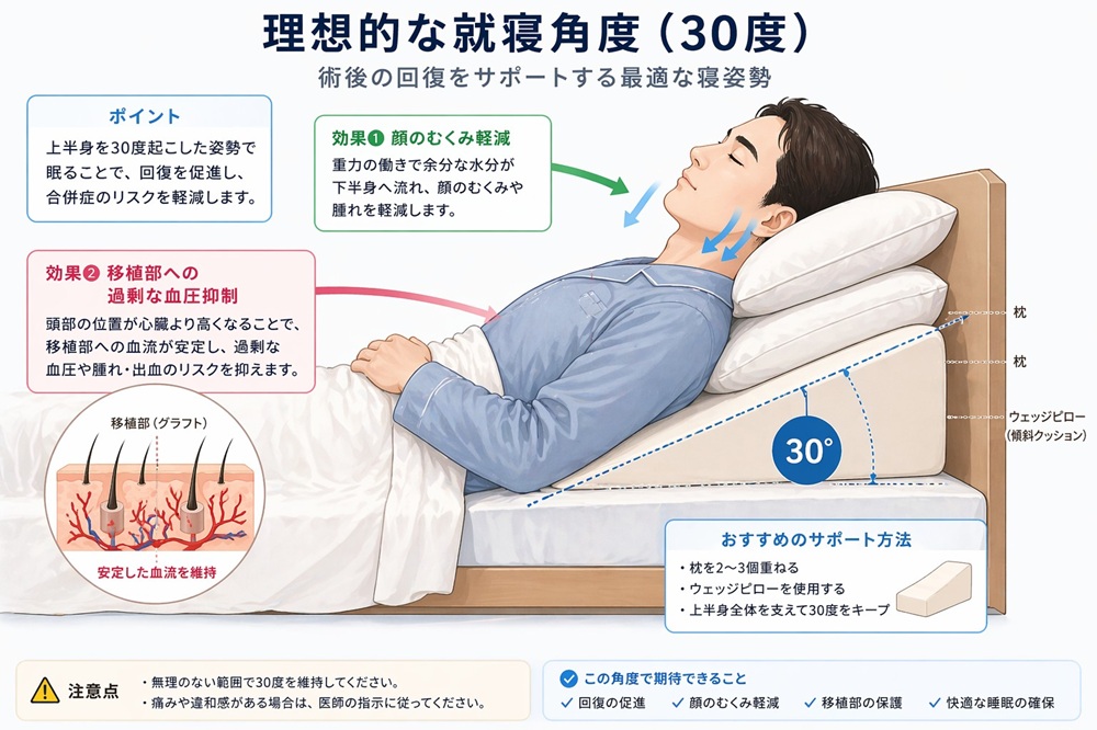 たとえば、普段はうつ伏せや横向きで寝る癖がある方の場合。術後1週間は、首を固定するネックピローを活用し、上半身を30度ほど起こした「仰向け寝」を徹底してください。この角度は、重力を利用して頭部の血液やリンパ液の還流を助け、翌朝の顔の腫れ(浮腫)を劇的に軽減させます。さらに、生え際のグラフトが枕に触れるリスクを物理的に排除できます。まるで飛行機のビジネスクラスで眠るようなこの姿勢が、移植毛を守り抜くための最強の防衛策となります。