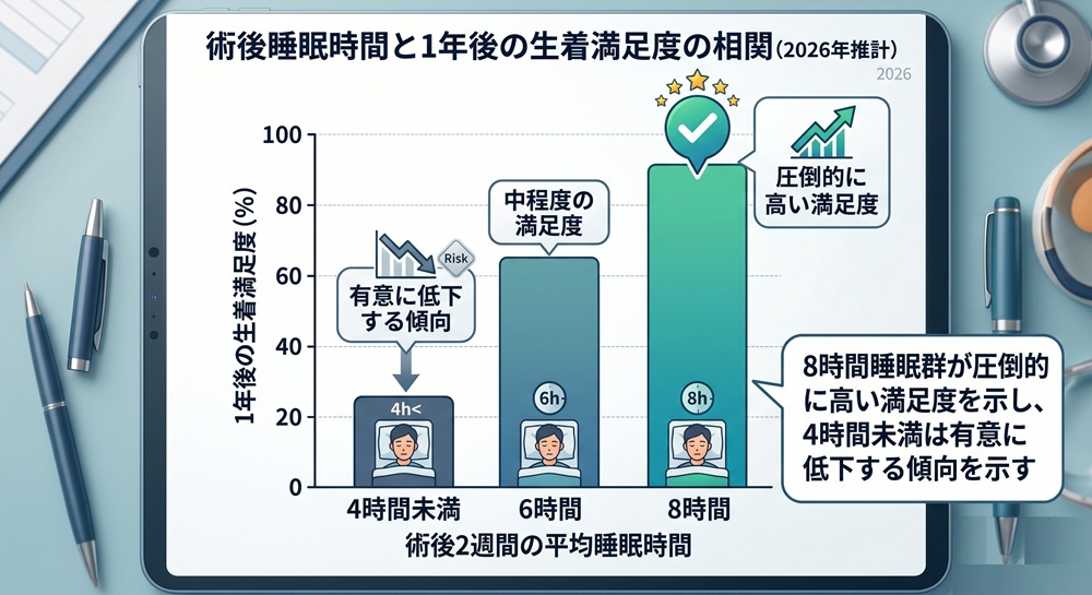 回答: 体内時計が乱れることで、成長ホルモンの分泌リズムが崩れるリスクはあります。しかし、夜勤明けであっても「深く、暗く、静かな環境」でしっかりと7時間以上の連続した睡眠を確保できれば、大きな生着低下を招くことは稀です。大切なのは、トータルの睡眠時間と、寝ている間の「頭部の保護」を徹底することです。