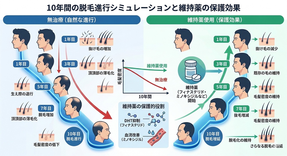 「完成したからもう安心だ」と全ての治療をやめてしまうのは、専門家の視点から見ると最も危険な選択です。植えた毛は抜けませんが、その周囲にある元々の髪は、依然としてAGA(男性型脱毛症)の進行に晒されています。ここで注意すべきがアイランド現象です。